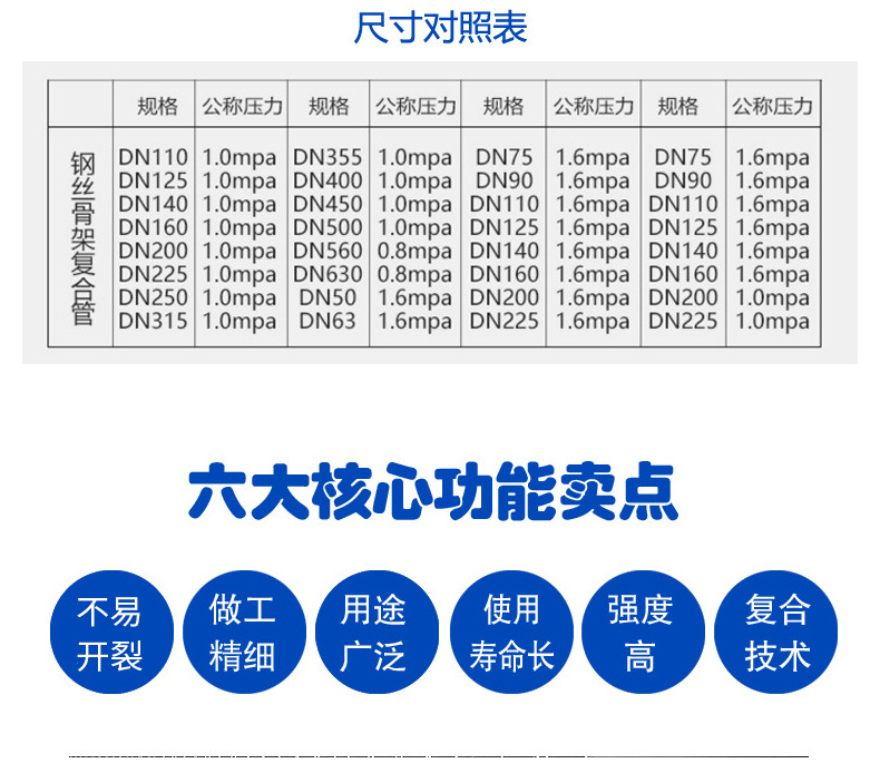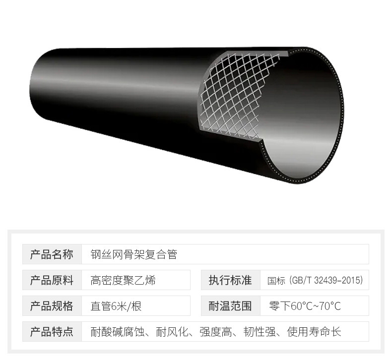 鋼絲網(wǎng)骨架聚乙烯復(fù)合管不但具有防腐、不結(jié)垢 、光滑低阻、保溫不結(jié)蠟、耐磨、質(zhì)量輕等塑料管的共同特點,而且其獨特的結(jié)構(gòu)還造就了如下特點: